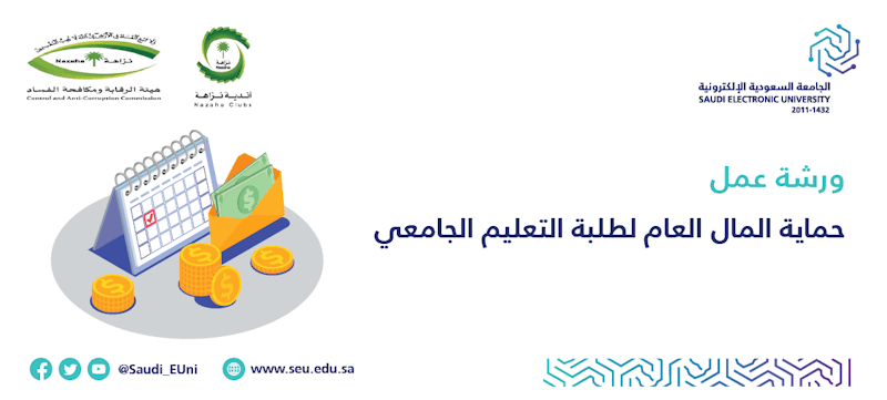 يسر عمادة القبول وشؤون الطلاب متمثلة بنادي نزاهة الطلابي بالتعاون مع هيئة الرقابة ومكافحة الفساد، دعوتكم لحضور ورشة عمل بعنوان: حماية المال العام لطلبة التعليم الجامعي.