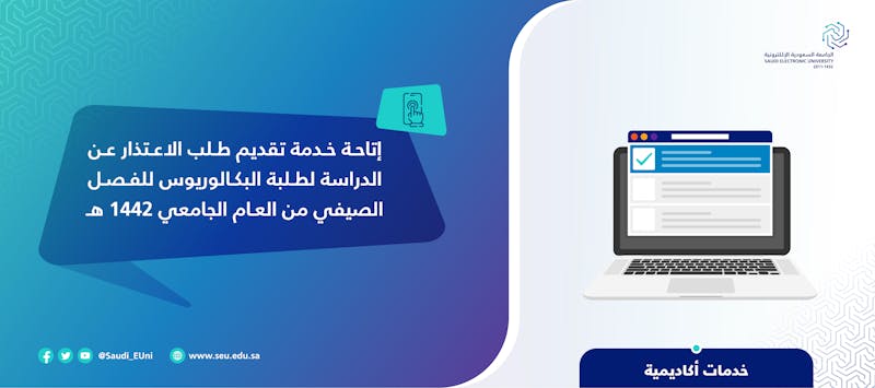 تعلن عمادة القبول وشؤون الطلاب عن بدء تقديم طلب الاعتذار عن الدراسة للفصل الصيفي للعام الجامعي 1442هـ