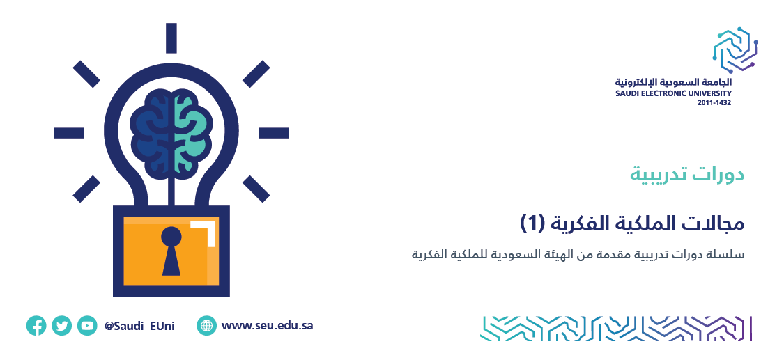 تعلن وحدة دعم الملكية الفكرية بالجامعة السعودية الإلكترونية عن توفر مجموعة من الدورات التدريبية المجانية المتنوعة، والتي تنظمها الهيئة السعودية للملكية الفكرية للمهتمين في مجالات الملكية الفكرية، وللتسجيل في هذه الدورات يرجى اتباع رابط التسجيل لكل دورة تدريبية في القائمة أدناه:
