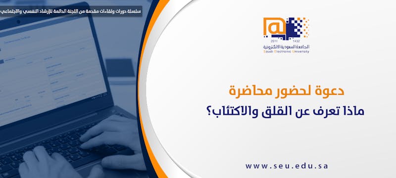 يسر اللجنة الدائمة للإرشاد النفسي والاجتماعي بالجامعة السعودية الإلكترونية دعوتكم لحضور محاضرة بعنوان: ماذا تعرف عن القلق والاكتئاب؟