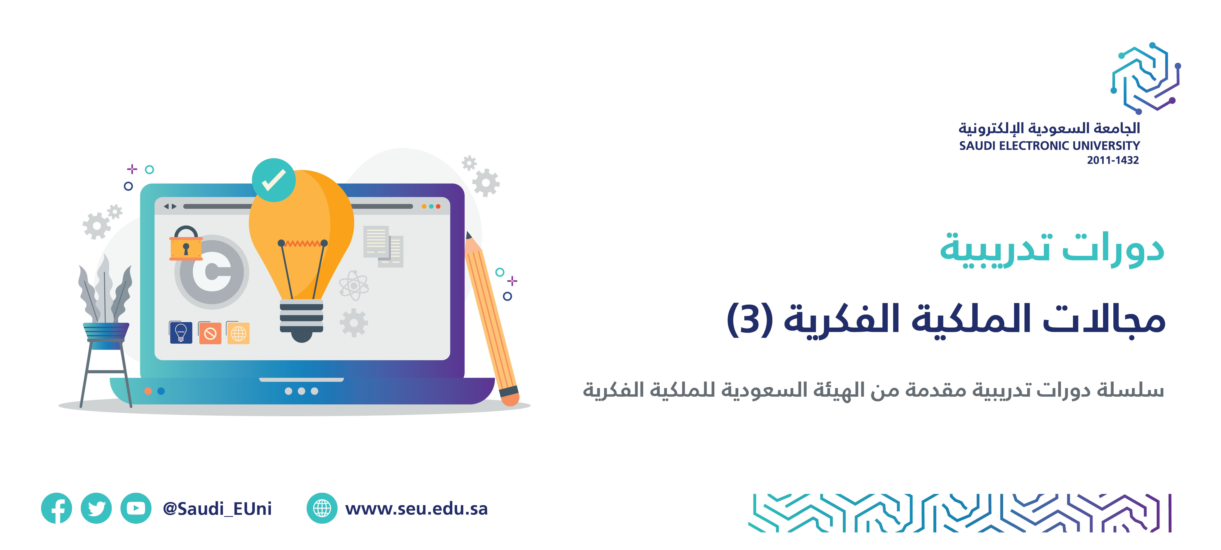 تعلن وحدة دعم الملكية الفكرية بالجامعة السعودية الإلكترونية عن توفر مجموعة من الدورات التدريبية المتنوعة، والتي تنظمها الهيئة السعودية للملكية الفكرية للمهتمين في مجالات الملكية الفكرية، وللتسجيل في هذه الدورات يرجى اتباع رابط التسجيل لكل دورة تدريبية في القائمة أدناه: