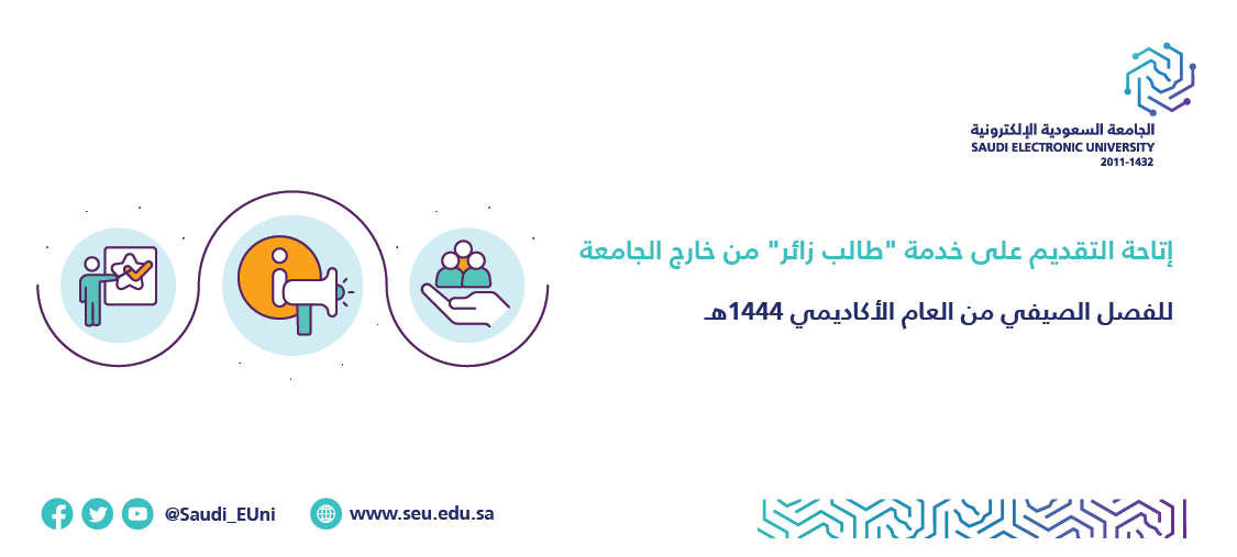 تعلن عمادة القبول وشؤون الطلاب عن بدء التقديم على خدمة طالب زائر من خارج الجامعة (طلبة الجامعات الأخرى الراغبين بدراسة مقررات دراسية داخل الجامعة السعودية الإلكترونية)