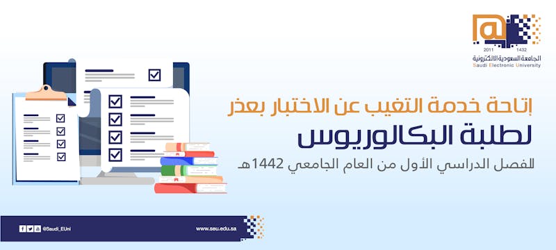 تعلن عمادة القبول وشؤون الطلاب عن موعد إتاحة خدمة تقديم أعذار التغيب عن الاختبارات الفصلية للفصل الدراسي الأول من العام الجامعي 1442هـ.