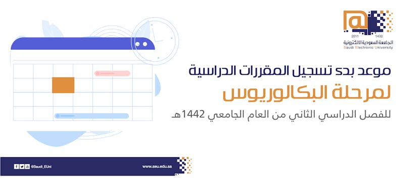 تعلن وكالة الجامعة للشؤون التعليمية عن موعد بدء التسجيل لمقررات مرحلة البكالوريوس للفصل الدراسي الثاني من العام الجامعي 1442هـ.