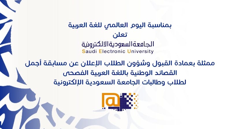 تعلن عمادة القبول وشؤون الطلاب عن مسابقة الشعر العربي الفصيح لطلاب وطالبات الجامعة السعودية الإلكترونية بجميع الفروع حسب الشروط التالية: