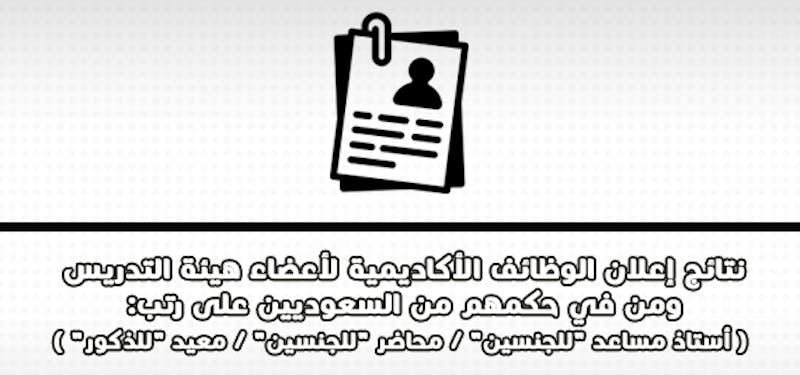 تعلن عمادة شؤون أعضاء هيئة التدريس والموظفين بالجامعة السعودية الإلكترونية عن نتائج إعلان الوظائف الأكاديمية لأعضاء هيئة التدريس ومن في حكمهم من السعوديين على رتب ( أستاذ مساعد "للجنسين" – محاضر "للجنسين"-معيد "للذكور" )