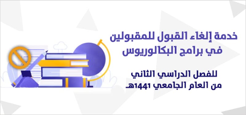 تعلن عمادة القبول وشؤون الطلاب عن فتح استقبال طلبات إلغاء القبول للمتقدمين الحاصلين على القبول والراغبين في إلغاء القبول للفصل الدراسي الثاني من العام الجامعي 1441هـ