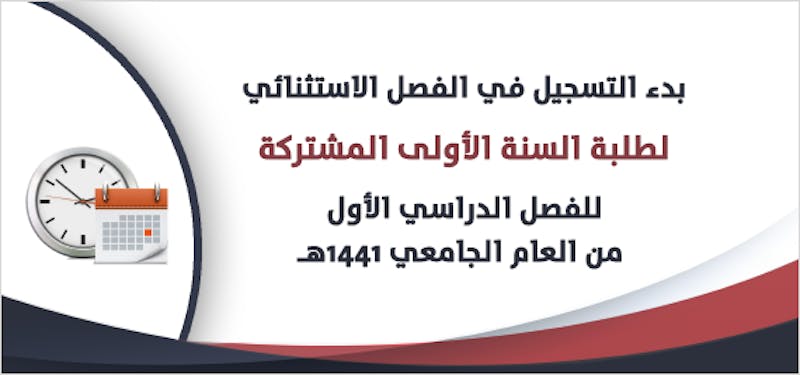 تعلن عمادة السنة الأولى المشتركة (السنة التحضيرية) عن بدء تسجيل الفصل الاستثنائي للفصل الدراسي الأول من العام الجامعي 1441هـ