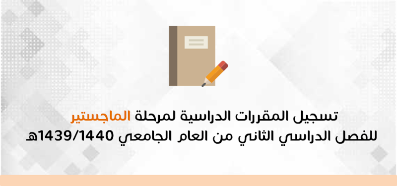 تعلن عمادة الدراسات العليا عن موعد التسجيل للمقررات الدراسية لمرحلة الماجستير للفصل الدراسي الثاني من العام الجامعي ١٤٣٩/ ١٤٤٠ هـ
