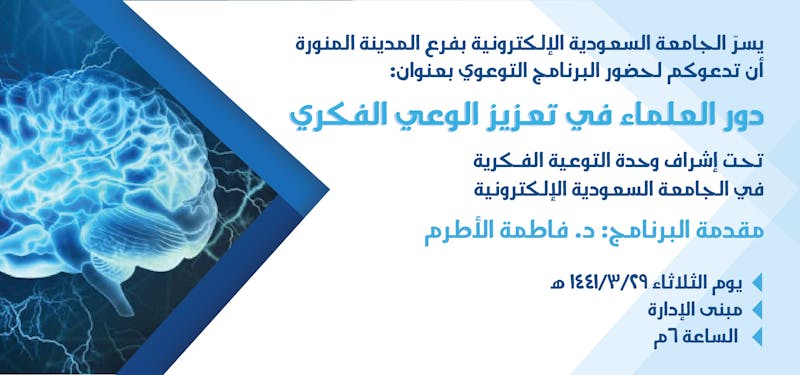 يسر شطر الطالبات بفرع المدينة المنورة بالجامعة السعودية الالكترونية أن تدعوكم لحضور البرنامج التوعوي بعنوان: دور العلماء في تعزيز الوعي الفكري