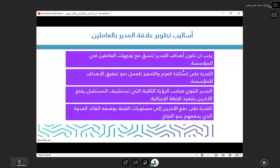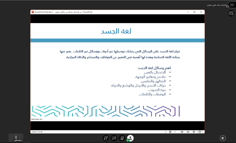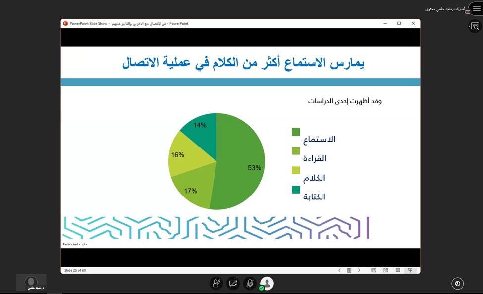 وعرفت الدورة التدريبية بمفهوم الاتصال، وكيف تطورت مراحله عبر السنين، وتناولت أشهر الأنماط الشخصية، وطرق التعامل مع كل نمط وآليات التواصل واستقبال المعلومات معهم، وتحدثت عن فاعلية التواصل الفعال في المنظمات وأهميته، واستعرضت أهم مهارات الاتصال الفعّال.