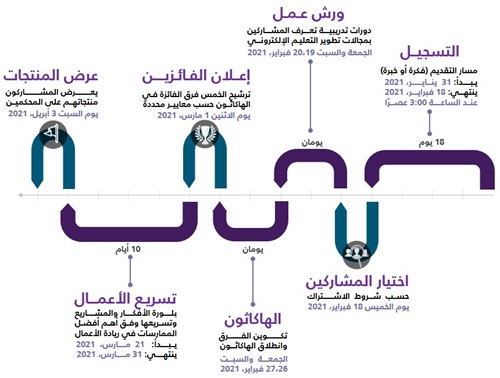يحضر المشاركين مجموعة من الدورات الافتراضية للتعرف على مجالات تطوير التعليم الإلكتروني. يلتزم المشاركون بحضور ورش العمل وتسليم التكليفات للاستمرار لمرحلة الهاكاثون.