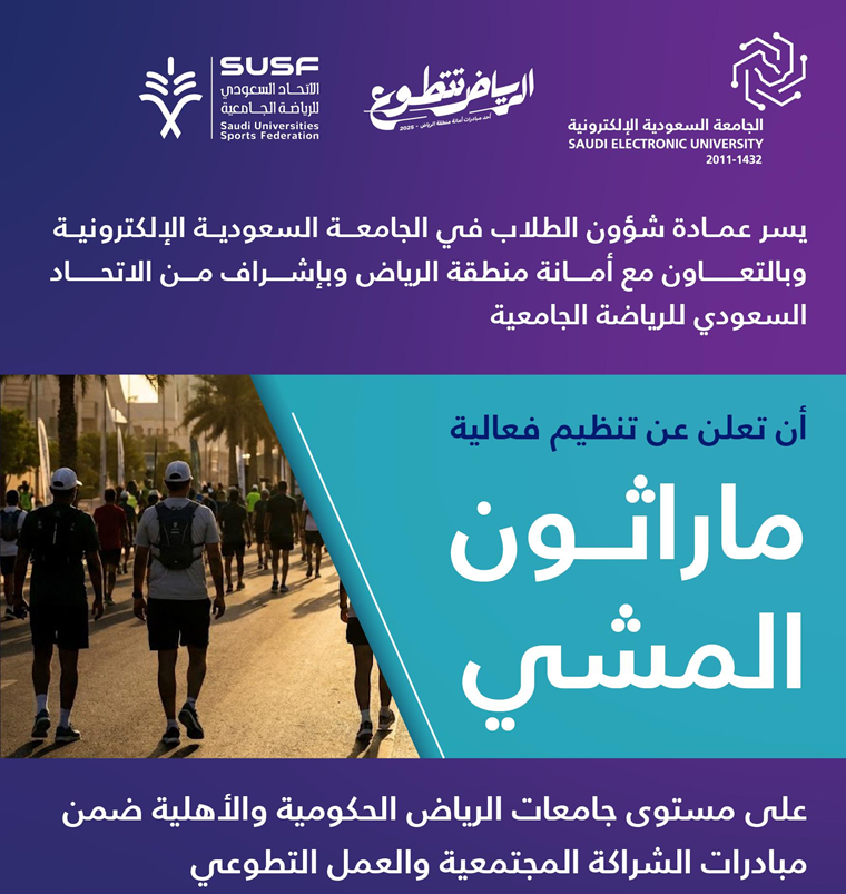 نفّذت عمادة شؤون الطلاب في الجامعة السعودية الإلكترونية، بالتعاون مع أمانة منطقة الرياض وتحت إشراف الاتحاد السعودي للرياضة الجامعية، مجموعة من المبادرات التطوعية والرياضية ضمن "الرياض تتطوع 2025"، شملت زراعة ورصد الحدائق العامة، وإطلاق ماراثون المشي على مستوى جامعات مدينة الرياض الحكومية والأهلية.