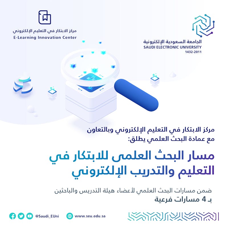 أعلنت الجامعة السعودية الإلكترونية ممثلةً بمركز الابتكار في التعليم الإلكتروني بالشراكة مع عمادة البحث العلمي بالجامعة، استحداث مسار بحثي ضمن مسارات الأبحاث الموجودة في عمادة البحث العلمي، بهدف سد الفجوة المتمثلة في الأبحاث النوعية والكمية الدقيقة في مجالات الابتكار في التعليم والتدريب الإلكتروني.