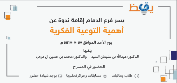 يسر الجامعة السعودية الإلكترونية بفرع الدمام دعوتكم لحضور ندوة أهمية التوعية الفكرية.