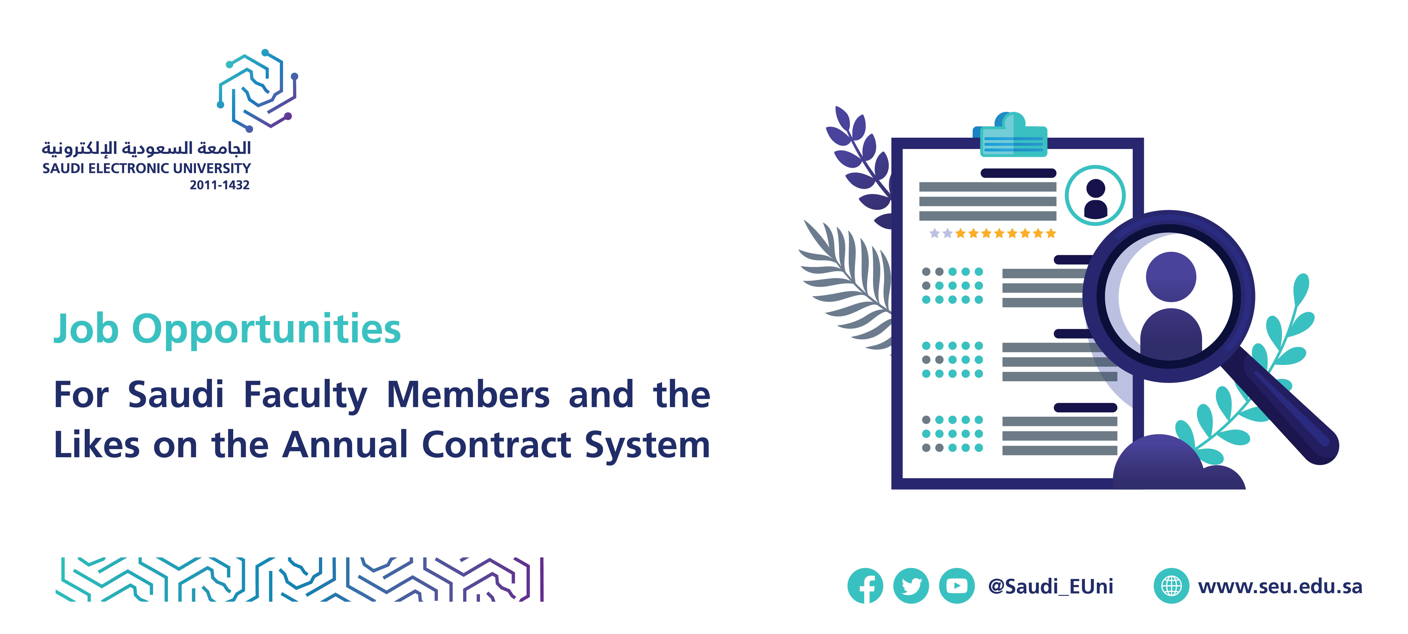 The Deanship of Human Resources at the Saudi Electronic University announces the availability of annual contract academic job opportunities for Saudis holding Master's and Doctorate degrees (female-male) for different colleges in the university and its branches; the conditions are as follow: