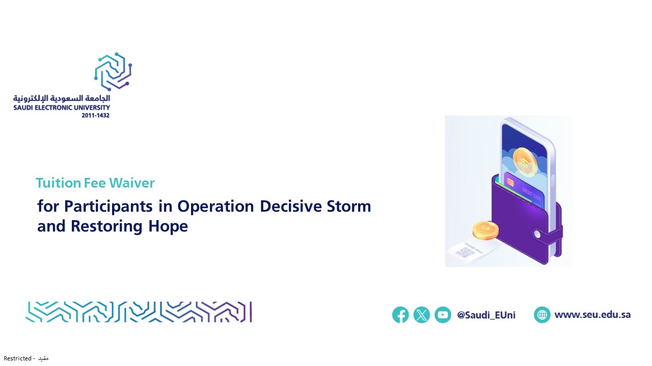 The Deanship of Student Affairs is pleased to announce the availability of submitting a tuition fee waiver request through the student services platform for those currently participating in Operation Decisive Storm and Restoring Hope for the second semester of the academic year 2024\ 2025.
