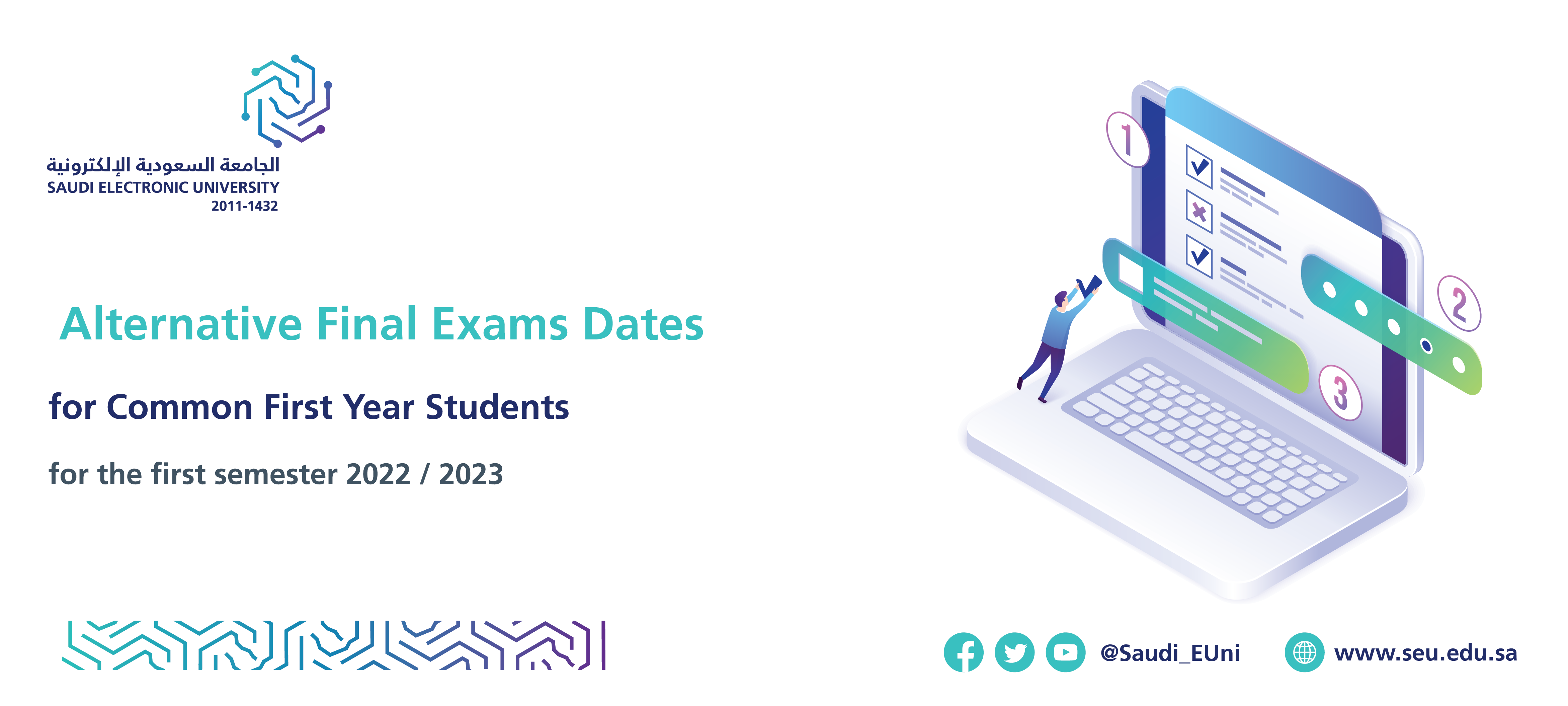The Common First Year Deanship is pleased to announce to its students who were unable to sit the final exams for the first semester 2022-2023 and whose excuses were accepted, that the alternative exam dates will be as follows: