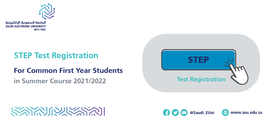 The Deanship of Common First Year announce the examination dates for STEP are between 24th of July 2022 and 12th of August 2022. All SEU students enrolled in summer course 2021/2022 of the English language program are advised to log in to Qiyas website and register for STEP exam. Registration fees for SEU students have been prepaid by the university. Note: Seats for STEP Test are limited.