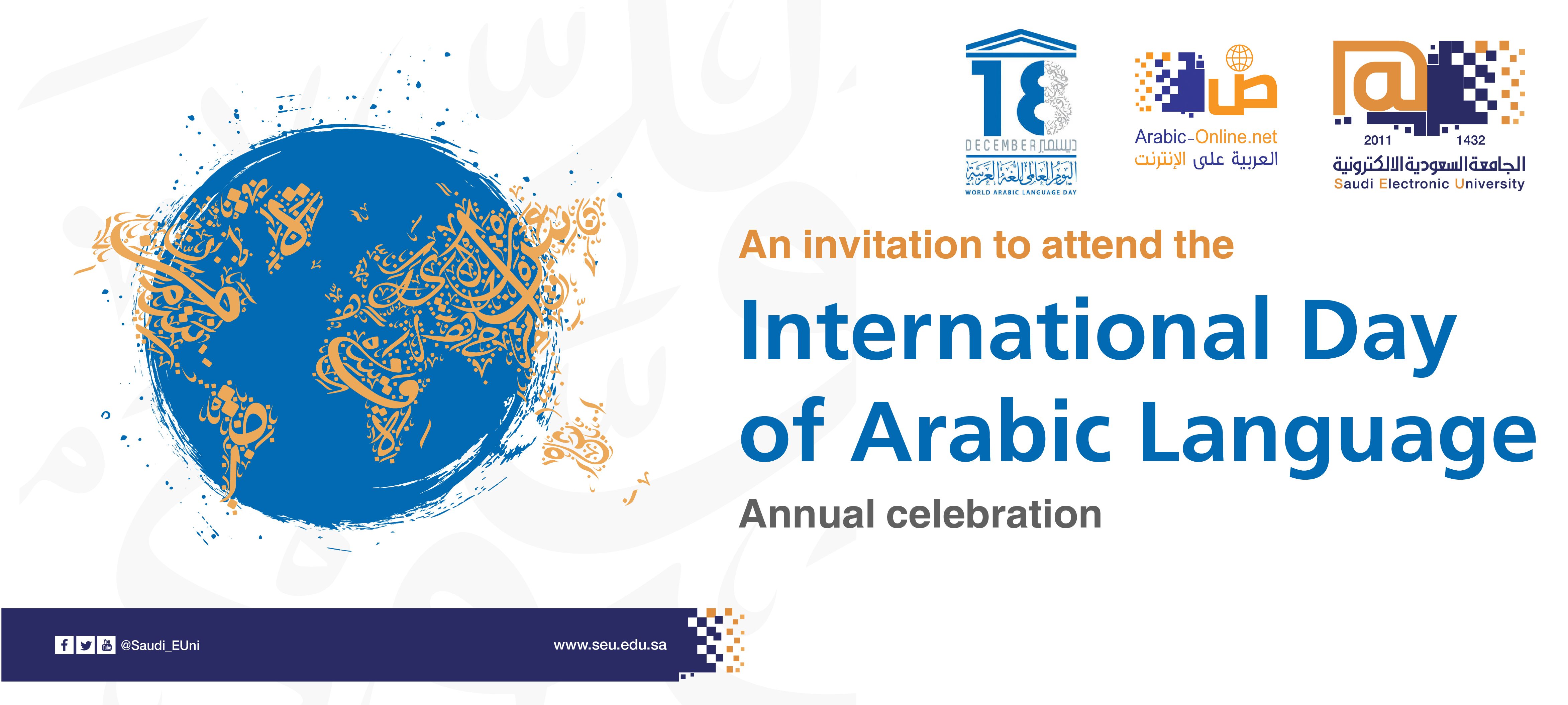 Saudi Electronic University, represented by the Arabic Online Program, is pleased to invite you to attend the International Day of the Arabic Language annual celebration.