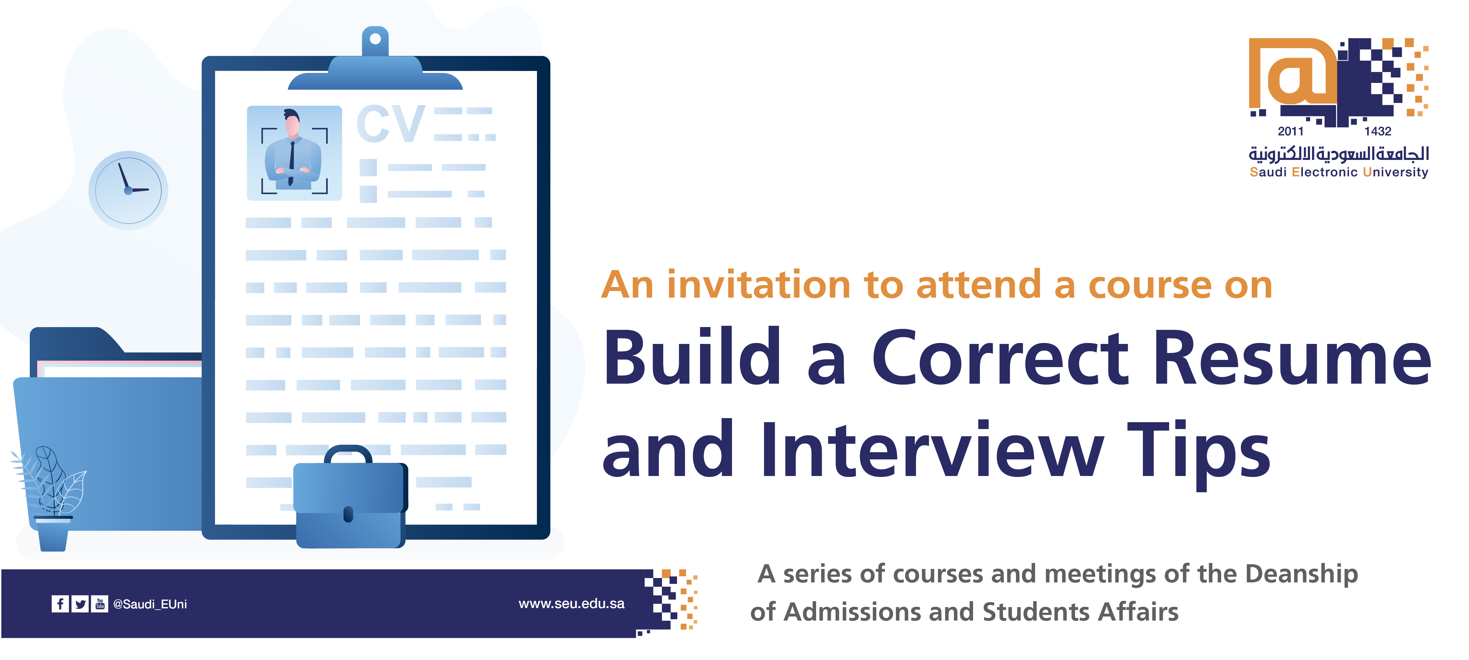 The Deanship of Admissions and Student Affairs invites you to attend a training course entitled: Build a Correct Resume and Interview Tips.