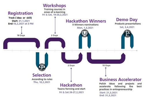 The eLearning Innovation Hackathon and Accelerator program provides an opportunity for innovators to provide innovative technological products/solutions in the field of eLearning. This program brings the participants with a selection of specialists in eLearning technologies, software development, and business in a hackathon which will produce several innovative projects, that are supported then accelerated by a business accelerator by applying the best practices in business management, marketing, and financial management. All program phases are implemented remotely using an interactive virtual platform. There are two paths for participation: idea in the field of e-learning (presentation, development, management, measurement, and quality) and a clear vision to develop it. The other track is a skill in software and applications development which includes programming, design, data management, and software project management.