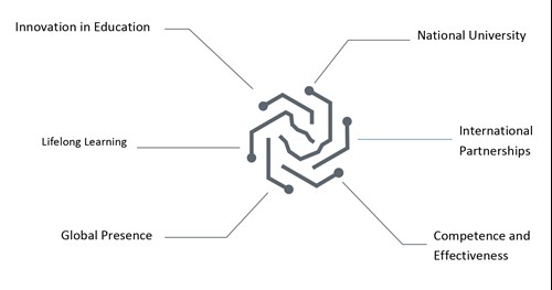 This logo is derived from the Kingdom's Vision 2030 as a national strategy that focuses on human capital and the cognitive and technological input, enforcing digital education for this evolution. All this is embodied in the University and its values and non-typical modern thinking, reaching horizons of true creativity for its students and faculty members, representing the backbone of the Kingdom's digital transformation.
