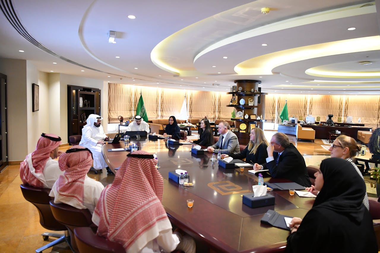 Her Excellency Prof. Lilac Alsafadi, President of the Saudi Electronic University, received Prof. Gareth Stansfield, Vice President of the University of Exeter in the UK, Executive Dean, and Professor of Middle East Politics, today at the university’s headquarters in Riyadh. He was accompanied by several officials at the University of Exeter. In addition, university vice presidents and deans of colleges, and supported deanships were present.