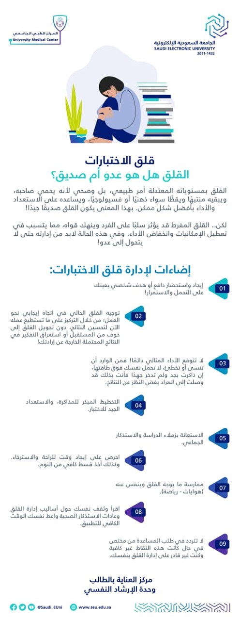 قام فرع الجامعة السعودية الإلكترونية و وبالتعاون مع وحدة الإرشاد النفسي بعرض توعوية كمنشورات جدارية على اللوحات الإعلانية و في أرجاء الفرع وذلك للتوعية أن فترة الاختبارات هي الفترة الحاسمة لكل طالب وطالبة. ويجب الاستعداد الجيد للاختبارات، والبعد عن التوتر والخوف والقلق، من خلال الاستعداد المبكر، وتقسيم المواد، وتنظيم جدول للاستذكار، تتخلله فترة راحة، حتى لا يصاب الطالب بالملل والتعب.