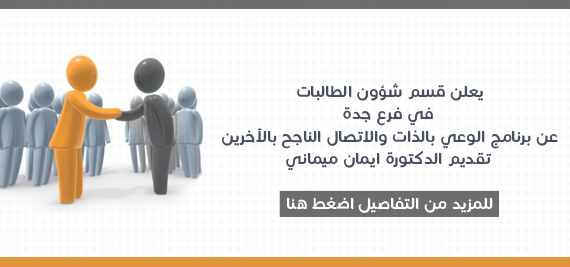يعلن قسم شؤون الطالبات في فرع جدة عن برنامج الوعي بالذات والاتصال الناجح بالآخرين تقديم الدكتورة ايمان ميماني