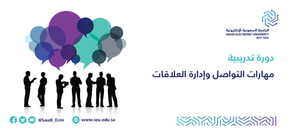 يسر فرع الجامعة السعودية الإلكترونية بالمدينة المنورة بالتعاون مع عمادة القبول وشؤون الطلاب دعوتكم لحضور دورة تدريبية بعنوان: مهارات التواصل وإدارة العلاقات.