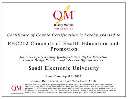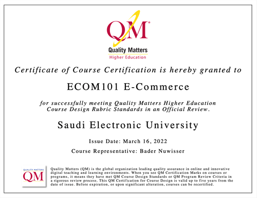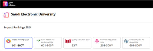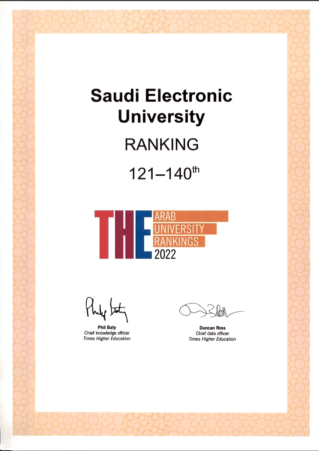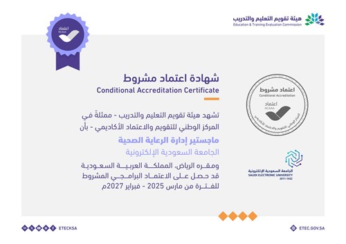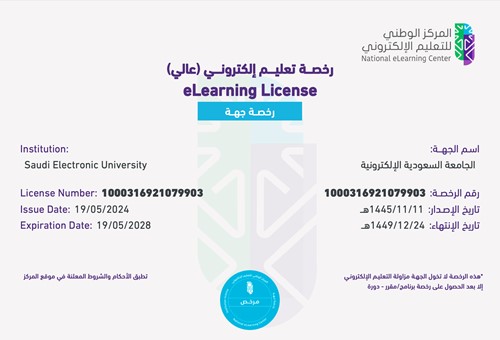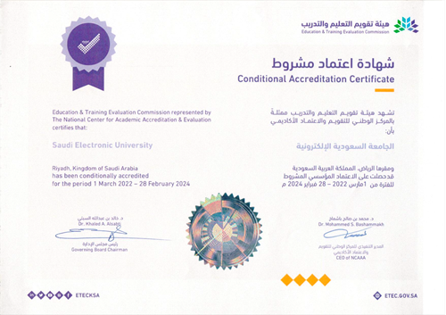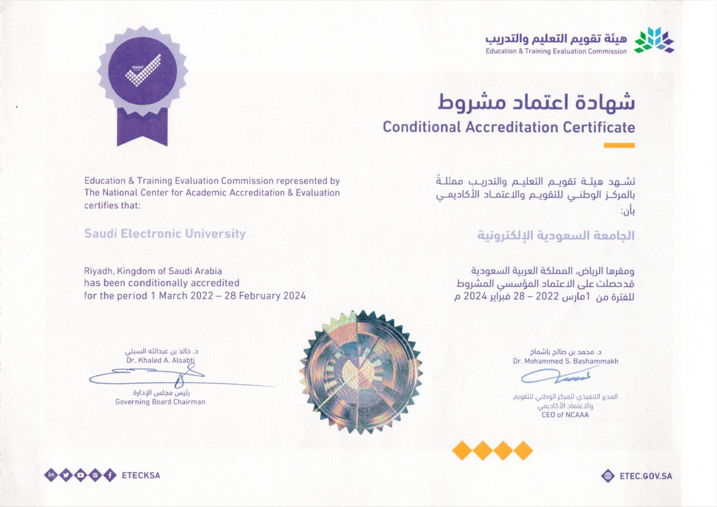 The Saudi Electronic University has received conditional institutional accreditation from the Education and Training Evaluation Commission, represented by the National Center for Academic Accreditation and Evaluation from 2022-03-01 to 28-02-2024.