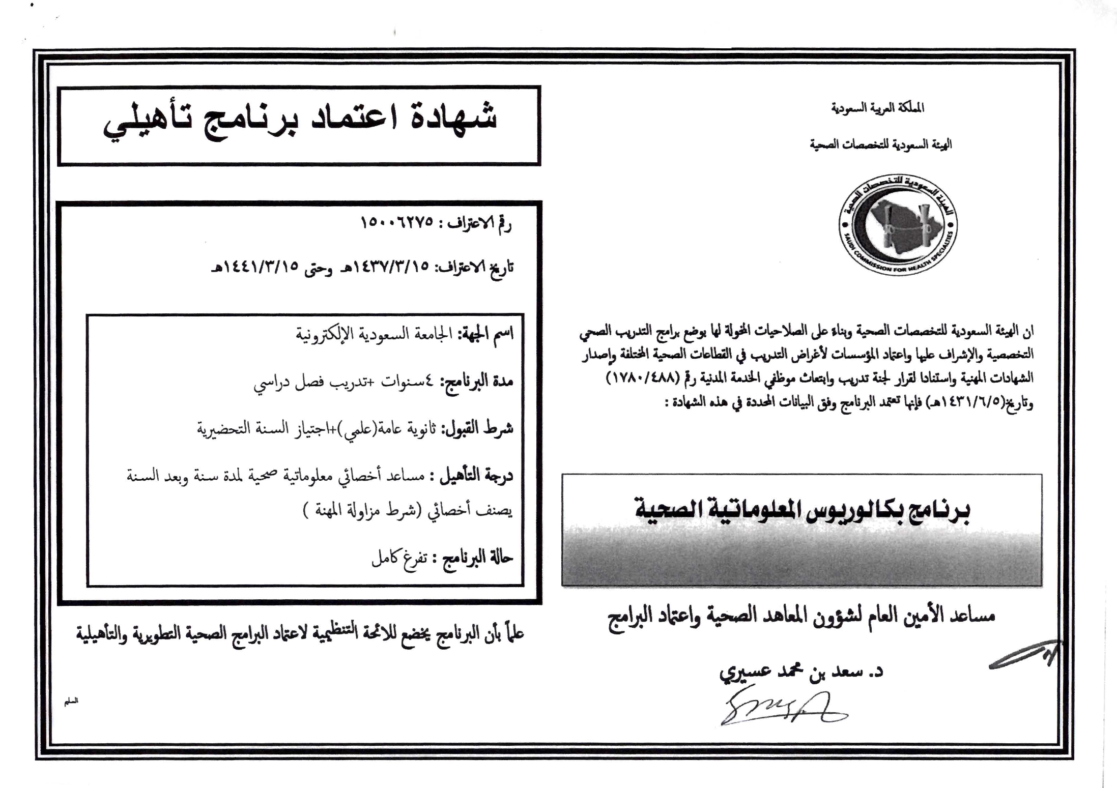 Accreditation Certificate for the Health Informatics Program from the Saudi Commission for Health Specialties