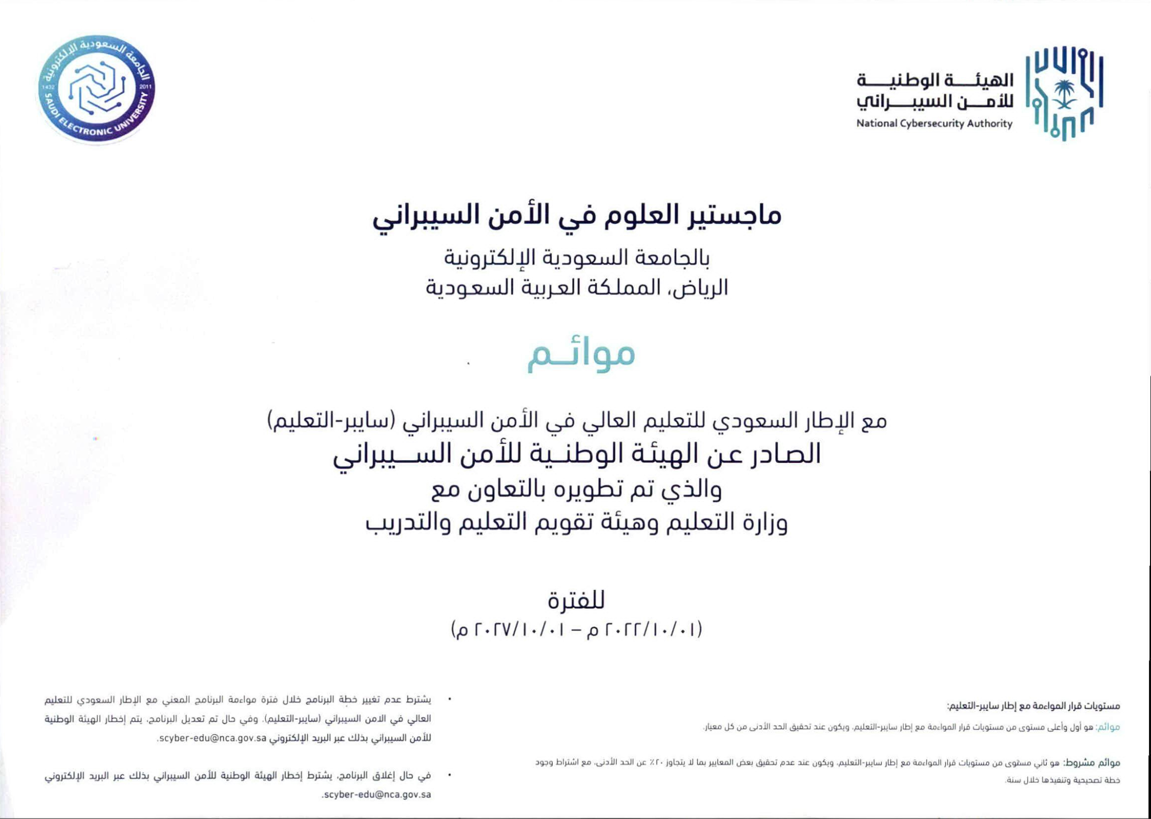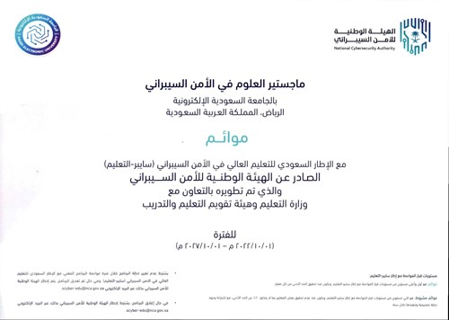 The Master's program in Cybersecurity, offered by the Saudi Electronic University, has received alignment accreditation with the "Cyber Education" framework, making it one of the higher education programs that meets the standards and requirements of the framework.