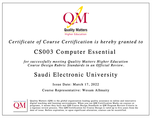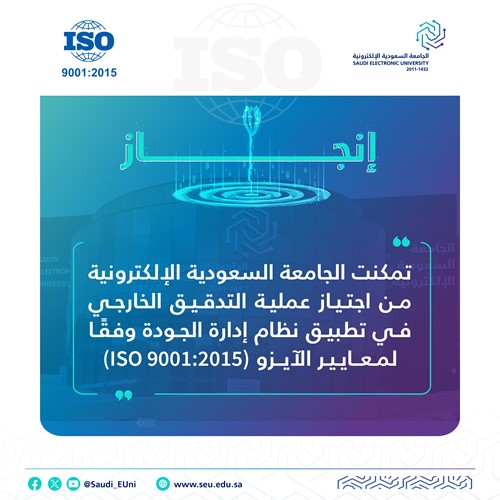 The Saudi Electronic University has successfully passed the external audit process for the implementation of its Quality Management System in accordance with the ISO 9001:2015 standards. This achievement is a culmination of the university's dedicated efforts and commitment to applying the highest quality standards, in line with international specifications and standards. It reflects the university's vision and strategic goals across all its academic, administrative, research, and community-related areas.