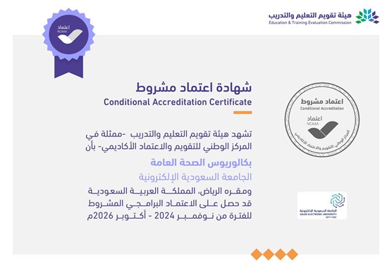 The Bachelor of Public Health program at the Saudi Electronic University has received conditional program accreditation from the Education and Training Evaluation Commission, represented by the National Center for Academic Accreditation and Evaluation.
