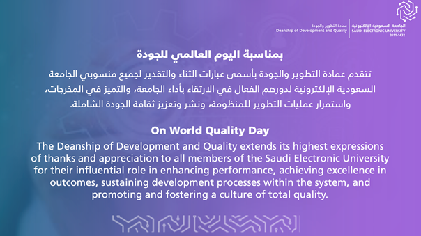 The Deanship of Development and Quality aims to familiarize university members with quality and its importance, working to raise awareness of the significance of implementing quality requirements and accreditations, and promoting its culture to achieve the university's vision and mission. This is being accomplished through the launch of the "Quality" initiative, which includes a series of workshops, meetings, educational content, student competitions, and other activities targeting all members according to the nature of the activity.